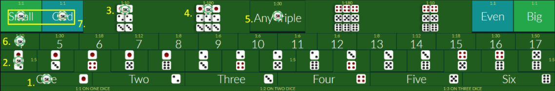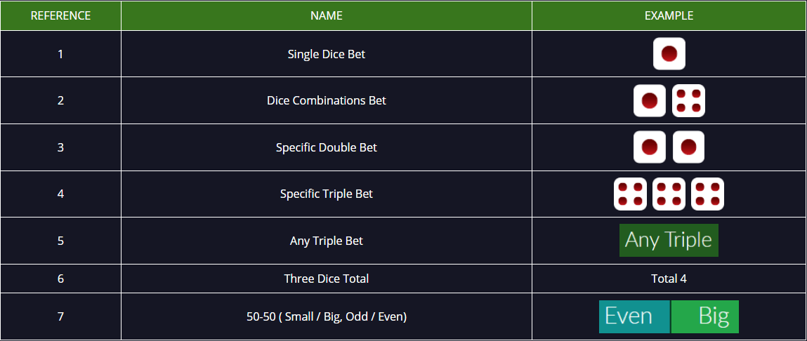 Permainan Sicbo merupakan sebuah permainan casino dimana menggunakan 3 buah dadu sebagai media permainan. Disini member dapat menebak berbagai jenis taruhan yang tersedia di meja Sicbo seperti total nilai 3 dadu, besar atau kecil, hingga menebak dadu kembar.